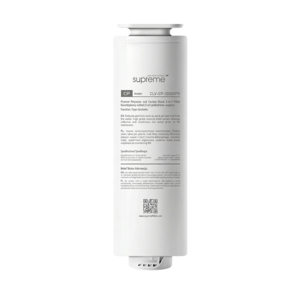 Oryginalny wkład filtrujący 2w1 przeznaczony do systemu odwróconej osmozy Supreme Clever 1200GPD. Filtr łączy dwa kluczowe etapy oczyszczania w jednej obudowie, skutecznie przygotowując wodę do filtracji przez membranę osmotyczną.