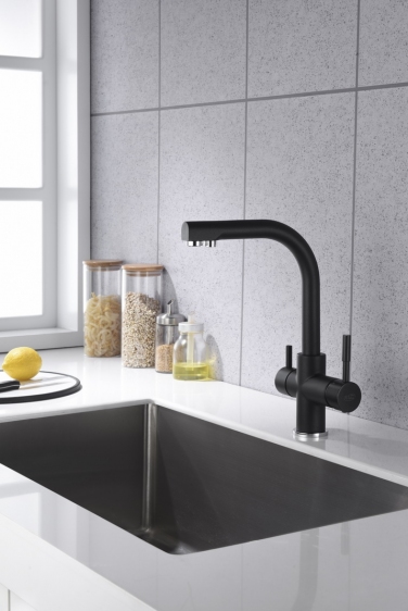 Modele wylewek Blue Water wyposażono w dwa niezależne obwody zasilania wody. Bateria dostarcza wodę zarówno w sieci wodociągowej jak i wodę przefiltrowaną. Dwuobwodowe łącze daje gwarancję, że woda te dwa rodzaje wody nie zmieszają się ze sobą na żadnym etapie. Bateria jest kompatybilna z większością standardowych systemów filtrowania wody. Można ją łatwo podłączyć do istniejącego systemu filtracji, jeżeli posiadasz taki w swoim domu.