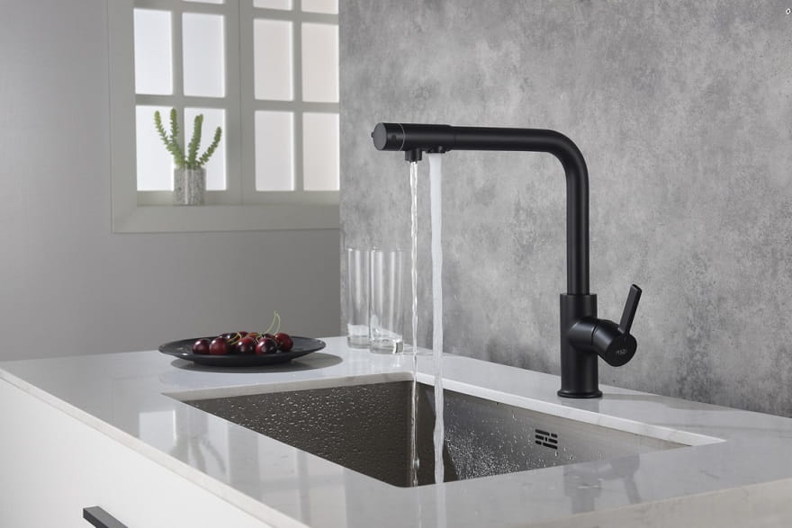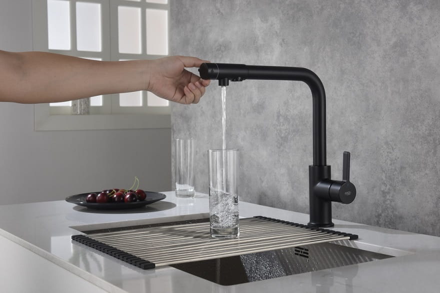 Kran do kuchni Royal Czarny Mat posiada dwa niezależne obwody, które doprowadzają wodę z różnych źródeł. Jeden kanał pobiera ciepłą i zimną wodę z sieci, natomiast drugi obwód można podłączyć bezpośrednio do filtra wody. Dzięki takiemu rozwiązaniu montaż dodatkowej wylewki do wody filtrowanej nie będzie koniecznością. Warto podkreślić, że woda filtrowana na żadnym etapie nie łączy się z wodą z sieci. Możesz spokojnie pić wodę filtrowaną prosto z kranu Royal. Bez ryzyka, że woda z sieci zanieczyści wodę filtrowaną. Przełączanie między wodą z sieci, a wodą filtrowaną następuje poprzez przekręcenie pokrętła na końcu wylewki.