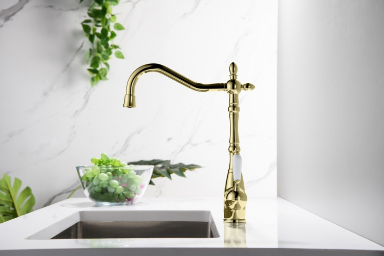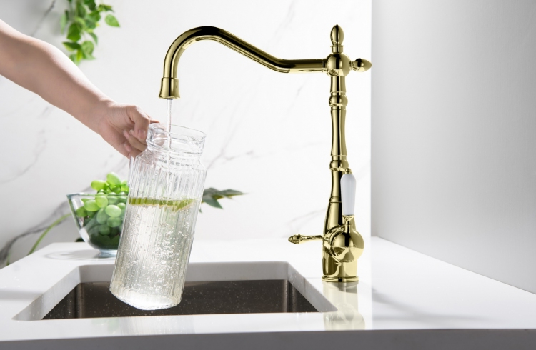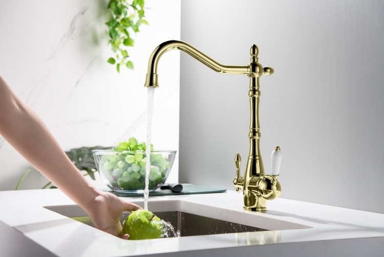 Trójdrożna bateria do kuchni SAXO Złoty połysk z podłączeniem do wody filtrowanej