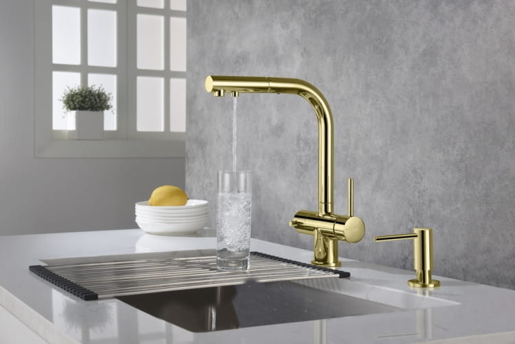 Dodanie złotego dozownika Alfa do zestawu z baterią dwuobwodową Blue Water to krok w kierunku spójnej, eleganckiej i funkcjonalnej przestrzeni kuchennej. Możesz mieć to wszystko od razu w komplecie (bateria + dozownik) lub zdecydować się na zakup osobno.