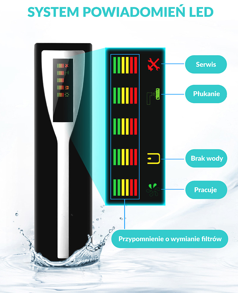 - informacja o niskim ciśnieniu – gdy woda zasilająca ma niskie ciśnienie system nie pracuje prawidłowo. Również powiadomi Cię o tym sygnał urządzenia.