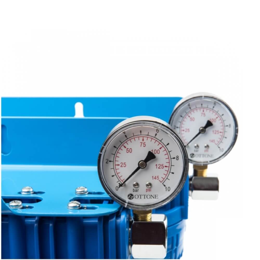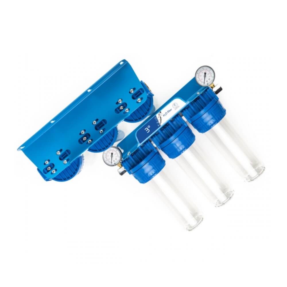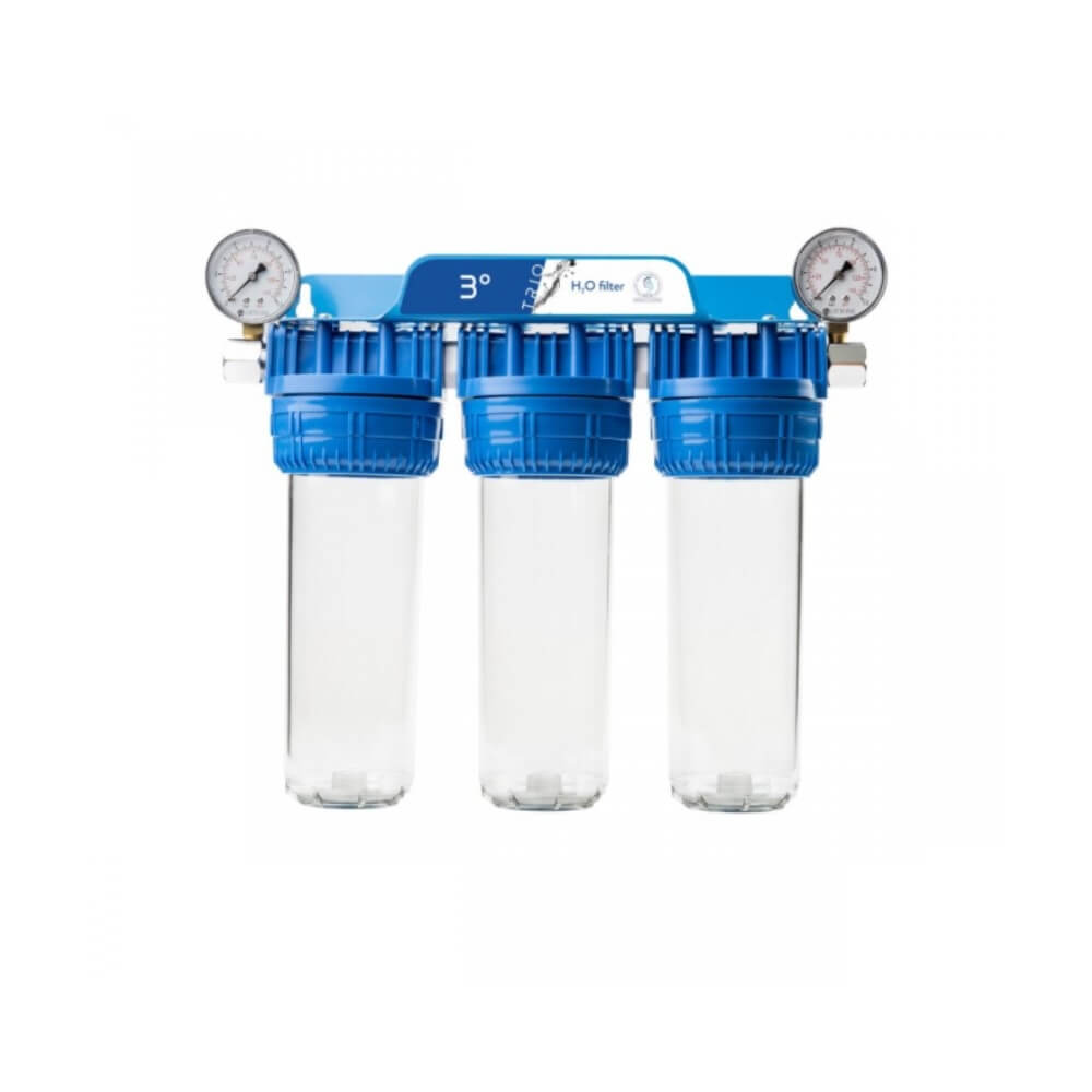 Zestaw trzech korpusów narurowych przeznaczony jest do instalacji na wejściu zimnej wody do budynku. Komplet korpusów do filtracji wody wyposażono jest w dwa manometry. Przyrządy te służą do pomiaru ciśnienia wody wejściowej i wyjściowej. Manometry wskazują, kiedy należy wymienić filtry. Jest to ważne, ponieważ z czasem wkłady filtracyjne zatykają się zanieczyszczeniami i tracą swoją skuteczność. W celu utrzymania jakości filtrowanej wody manometry ostrzegają o zbliżającym się zużyciu filtrów i konieczności ich wymiany. Trójstopniowy filtr z dwoma manometrami to kompleksowy system filtracji przeznaczony do usuwania różnego rodzaju zanieczyszczeń z wody. To idealna opcja do uzdatniania wody w gospodarstwie domowym.