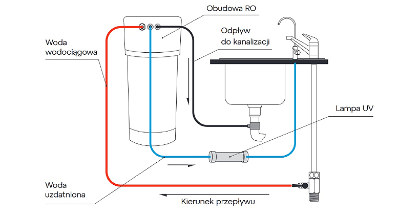 - Dioda LED UV-C nie generuje ciepła, tym samym nie podgrzewa przepływającej wody.
