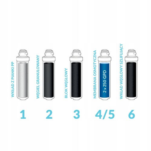 - 4 i 5 stopień – 2 x membrana osmotyczna 250 GPD z certyfikatem NSF