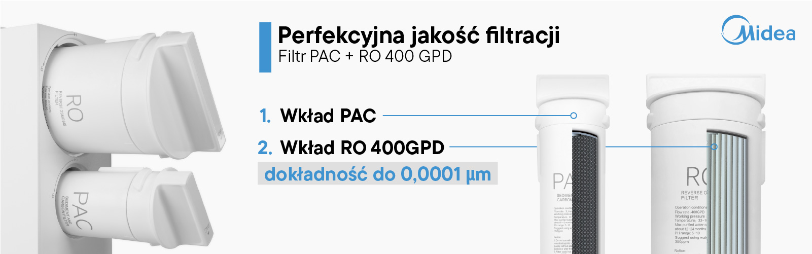 System Midea 400GPD wykorzystuje innowacyjne wkłady filtracyjne, w tym hybrydowy wkład PAC łączący właściwości pianki polipropylenowej i węgla aktywnego. Rozwiązanie to skutecznie usuwa z wody chlor, osady, metale ciężkie oraz poprawia jej smak i zapach. Wkład RO 400GPD to membrana osmotyczna, która skutecznie zatrzymuje bakterie, wirusy i inne drobnoustroje. Jako wariant możesz dodać do filtra jonizator wody Biocera, który wzbogaca przefiltrowaną wodę o niezbędne minerały, takie jak wapń i magnez, podnosząc jej walory zdrowotne i smakowe. Dodatkowy wkład jonizujący Biocera podnosi odczyn pH wody na prozdrowotny. Picie wody po jonizatorze Biocera wspomaga procesy regeneracyjne organizmu.